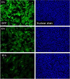 Ricin is a type 2 ribosome inactivating protein (RIP) belonging to the A-B family of toxins and is of particular interest because of its potential use as a biological weapon and the dearth of rapid and sensitive assays that could assist detection and decontamination. The ricin toxin inhibits protein synthesis by first binding to cell surface galactose residues, then entering the cell via endocytosis and inactivating ribosomes catalytically and irreversibly. A convenient, cell-based assay that was specific to the action of such a toxin would allow the biological activity of the protein to be assessed, since it would report the sensitivity of the cell to the receptor mediated endocytosis and cytoplasmic transport of the toxin, as well as the ultimate effect on protein synthesis. In this study, we used a stably transfected line of Vero cells that expresses green fluorescent protein (GFP), and we measured the loss of cellular GFP as an indicator for protein synthesis inhibition by the ribosome inactivator, ricin. The GFP construct used here consists of the sequence for dsEGFP (destabilized enhanced GFP) ligated to the promoter sequence for cytomegalovirus (CMV). Under control of the CMV promoter, GFP is constitutively expressed by the cells, and because it contains a proteasome-targeting peptide sequence (PEST), it is rapidly degraded with a half life of approximately 2-3 h as we have directly demonstrated by examining degradation rates in individual cells (Halter et al., Cytometry Part A, 2007). Changes in the synthesis rate of GFP due to interference with ribosome activity has a rapid effect on decreasing the cellular GFP levels in affected cells.