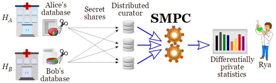 The application of SMPC together with differential privacy, as showcased in Figure 1, constitutes a more secure alternative to “central DP” and to “local DP”, where a curator combines the data but also becomes subject to privacy breaches, as explained in a previous post. Central DP compromises on security, by requiring a potentially hackable curator to serve as custodian of the data from multiple hospitals, to be able to answer queries in a DP manner. Local DP makes a tradeoff between privacy and accuracy, mitigating the foreseeable case of the hacking of the curator, by requiring that the data sent from each hospital to the curator has been DP-protected. SMPC (of differentially private statistics) enables the best of both worlds: it provides the best-possible accuracy (as in central DP), and it avoids the leakage potential from the possible breach of a curator (in both central and local DP).