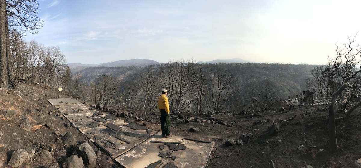 NIST researcher and fire protection engineer Alexander Maranghides views a landscape marred by the Camp Fire during a field data collection deployment.