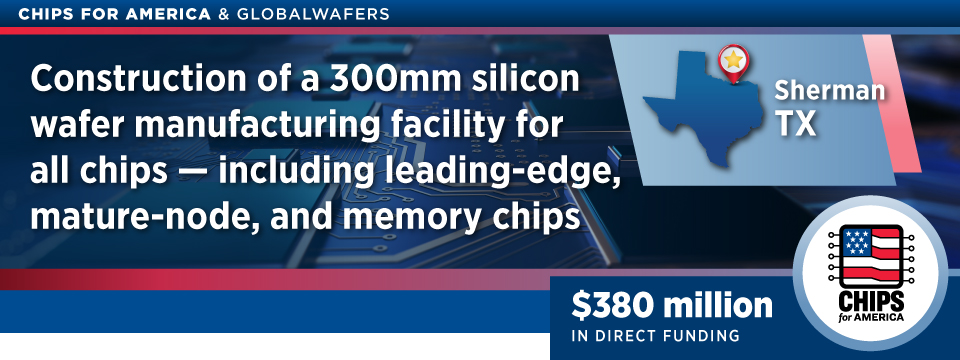 The U.S. Department of Commerce made direct funding awards to GlobalWafers America, LLC (GWA) and MEMC LLC (MEMC), subsidiaries of GlobalWafers Co., Ltd. (GlobalWafers), of up to $406 million to support the construction of new wafer manufacturing facilities in Sherman, Texas and St. Peters, Missouri.