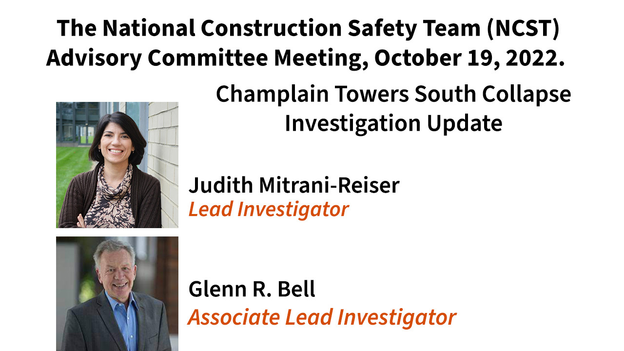 The National Construction Safety Team (NCST) Advisory Committee held a public update meeting on Oct. 19, 2022. The meeting provided an opportunity for NIST leadership to update the committee on the progress of NCST investigations focused on the Champlain Towers South partial building collapse that occurred in Surfside, Florida.