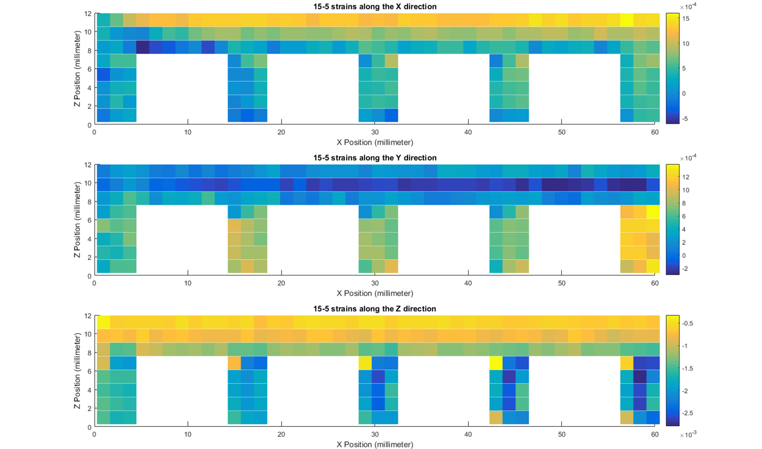 Figure 2: Measured residual strains for the 15-5 test specimen. Top image is longitudinal strain (x), middle is transverse strains (y), and bottom is strain in the build direction (z)