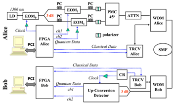 At Bob, another WDM is used to demultiplex the quantum and the classical channels. The quantum channels are polarization-decoded and detected by the up-conversion single-photon detectors, generating the raw key. Bob's board informs Alice of the location of the raw key data via the classical channel. After reconciliation and error correction, Alice and Bob obtain a common version of the secure key, which is further used to encode and decode the classical signal.
