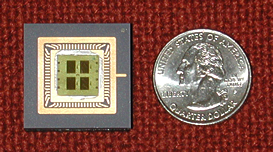 The glass microchip on the left measures 3 centimeters across—slightly more than the diameter of a quarter on the right—and is divided into four nanosoccer playing fields.
