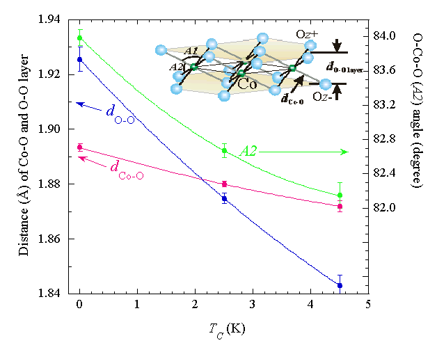 (Top) Structure for the NaxCoO2 1.4(D2/H2O) superconductor. The inset shows the D2O ice structure; for comparison the sketch in the middle shows the ice molecule superposed on the water block in the structure of the superconducting phase, demonstrating that the dimensions of the water block are close to those found in free ice. (Bottom) Interatomic distances for Co-O in the CoO2 layer, and the O-Co-O bond angle, as a function of the superconducting transition temperature TC. Note the strong dependence of TC on the bond angle A2 (defined in the inset), which determines the CoO2 layer thickness.
