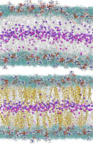 The purple "tails" of the lipid molecules that form the cell membrane are far less orderly in the absence of cholesterol (top image) than when cholesterol is present (bottom), a finding made possible by magnifying the membrane with neutron diffraction.