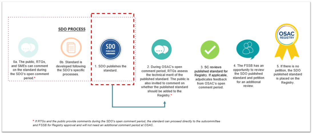 • Note: The public will have had an opportunity to provide feedback on the standard during its development process through the SDO's public comment period (see step 0a). This allows comments to be submitted during the SDO development process, before publication, enabling upgrades to be directly incorporated into the standard rather than receiving comments after it is published. In January 2022, the FSSB approved that the requirement for an OSAC open comment period (i.e., this step 2) can be met during the SDO's public comment period. In cases where OSAC can document the SDO's public comment opportunity, OSAC will not execute its own comment period.