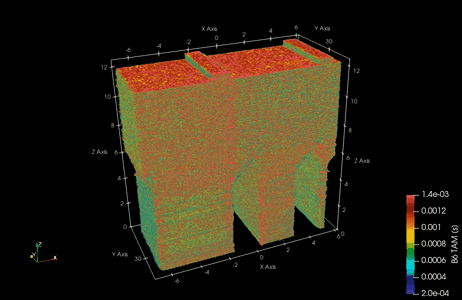 ‘Time above melt’ values processed from high speed, in-situ thermographic imaging of each layer a laser powder bed fusion 3D build and compiled into a digital twin of the part shape. Part of AM-Bench 2022 datasets.